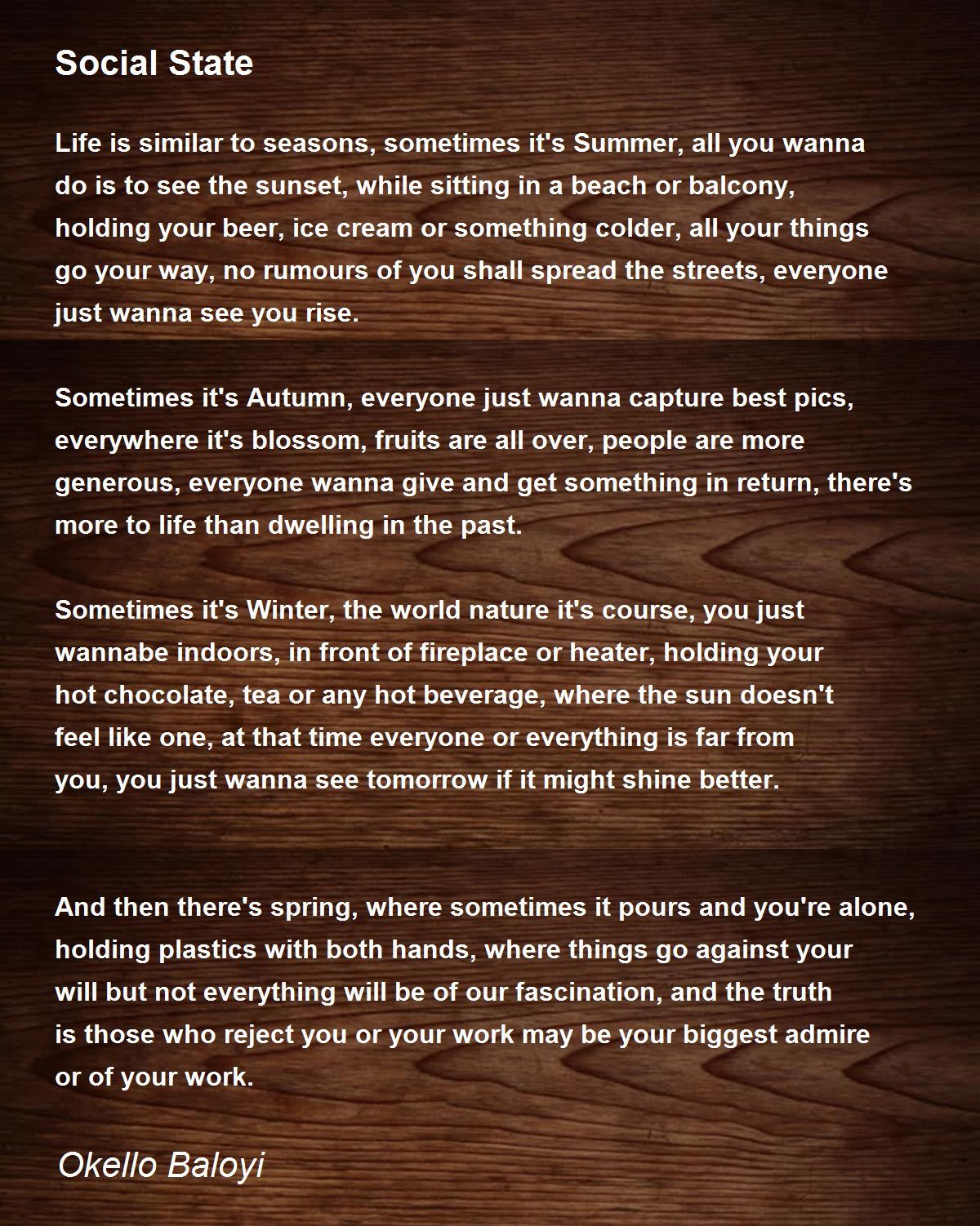 Life is similar to seasons, sometimes it's Summer, all you wanna do is to see the sunset, while sitting in a beach or balcony, holding your beer, ice cream or something colder, all your things go your way, no rumours of you shall spread the streets, everyone just wanna see you rise.