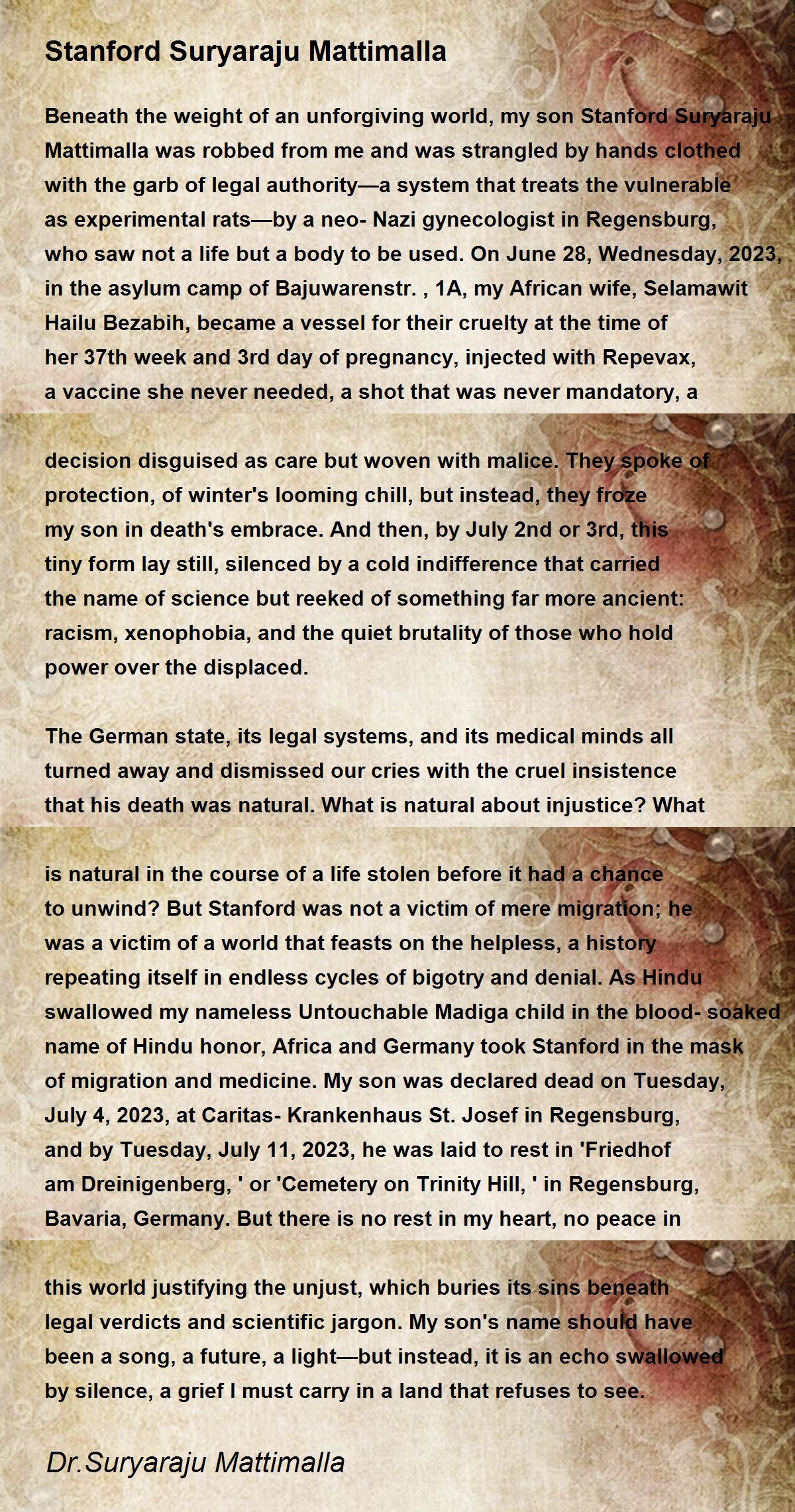 Beneath the weight of an unforgiving world, my son Stanford Suryaraju Mattimalla was robbed from me and was strangled by hands clothed with the garb of legal authority—a system that treats the vulnerable as experimental rats—by a neo-Nazi gynecologist in Regensburg, who saw not a life but a body to be used. On June 28, Wednesday,2023, in the asylum camp of Bajuwarenstr.,1A, my African wife, Selamawit Hailu Bezabih, became a vessel for their cruelty at the time of her 37th week and 3rd day of pregnancy, injected with Repevax, a vaccine she never needed, a shot that was never mandatory, a decision disguised as care but woven with malice. They spoke of protection, of winter's looming chill, but instead, they froze my son in death's embrace. And then, by July 2nd or 3rd, this tiny form lay still, silenced by a cold indifference that carried the name of science but reeked of something far more ancient: racism, xenophobia, and the quiet brutality of those who hold power over the displaced.