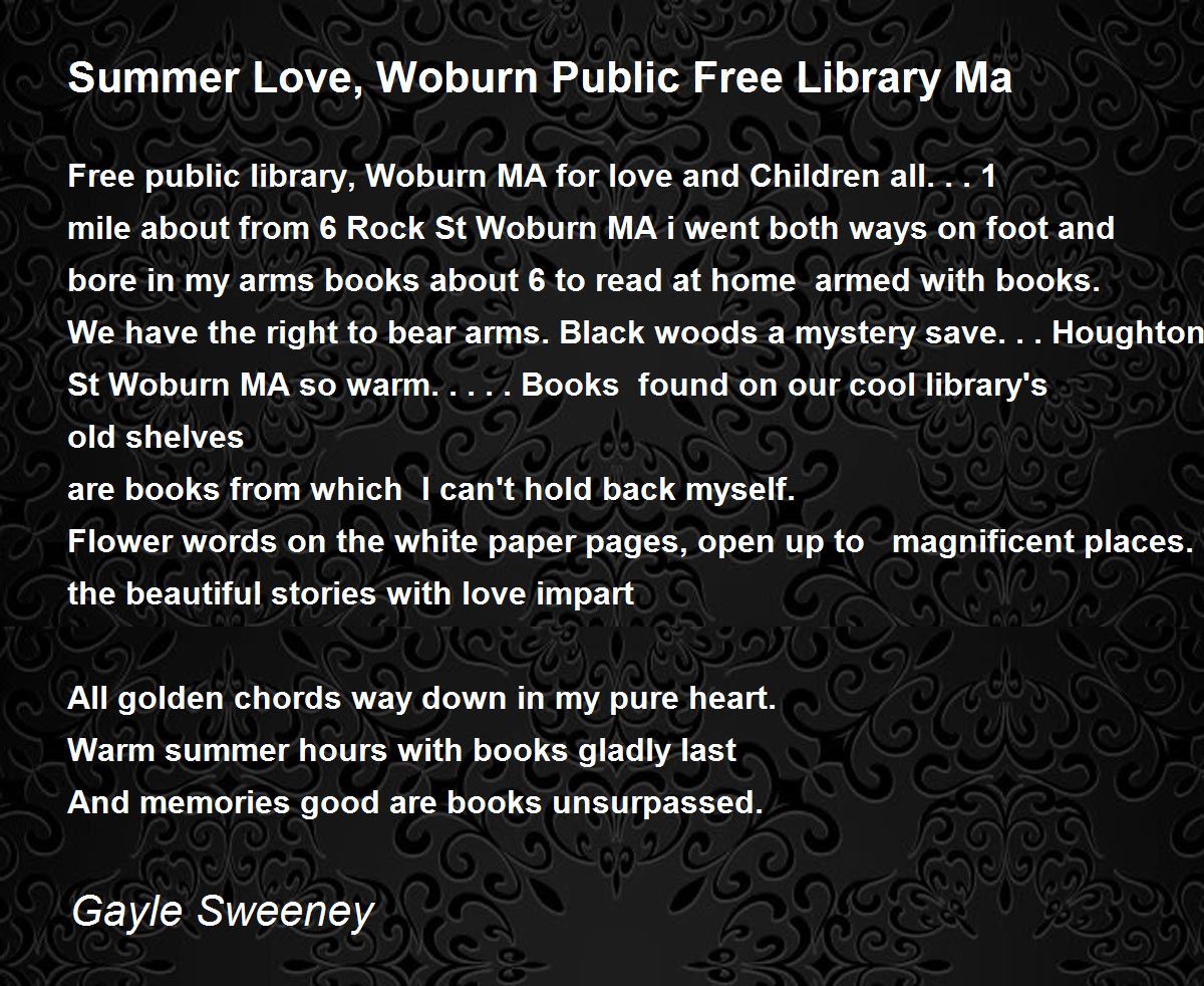 Free public library, Woburn MA for love and Children all...1 mile about from 6 Rock St Woburn MA i went both ways on foot and bore in my arms books about 6 to read at home armed with books. We have the right to bear arms. Black woods a mystery save...Houghton St Woburn MA so warm.....Books found on our cool library's old shelves