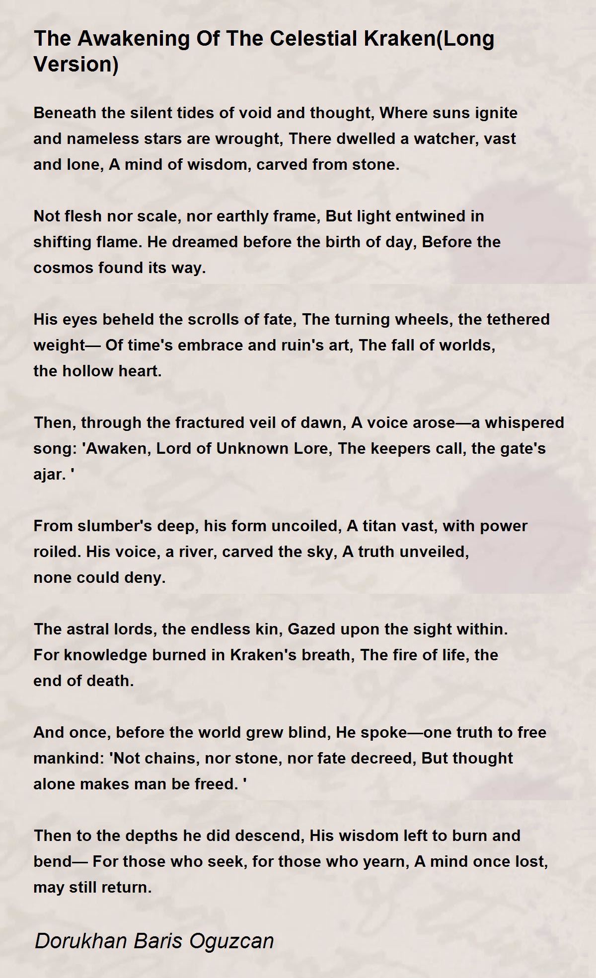 The astral lords, the endless kin, Gazed upon the sight within. For knowledge burned in Kraken's breath, The fire of life, the end of death.