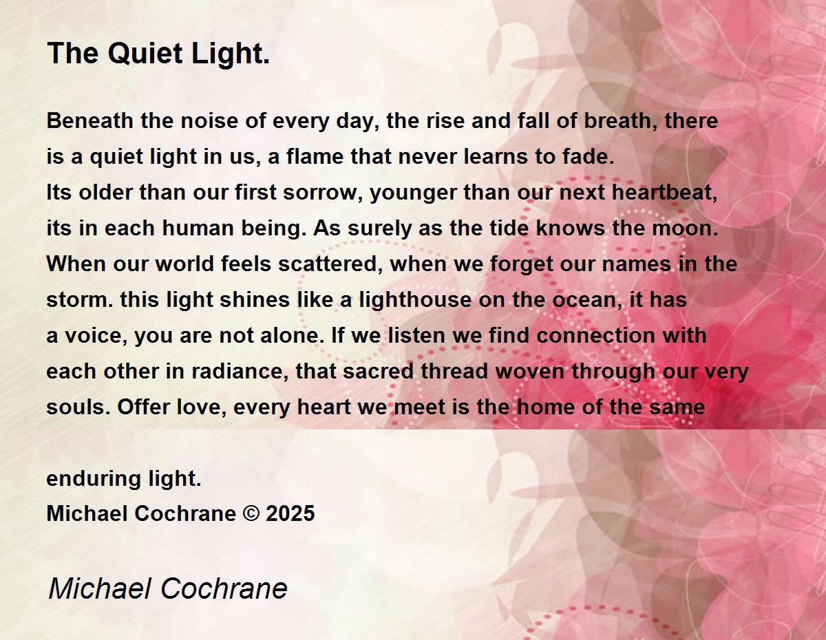 Its older than our first sorrow, younger than our next heartbeat, its in each human being. As surely as the tide knows the moon. When our world feels scattered, when we forget our names in the storm. this light shines like a lighthouse on the ocean, it has a voice, you are not alone. If we listen we find connection with each other in radiance, that sacred thread woven through our very souls. Offer love, every heart we meet is the home of the same enduring light.