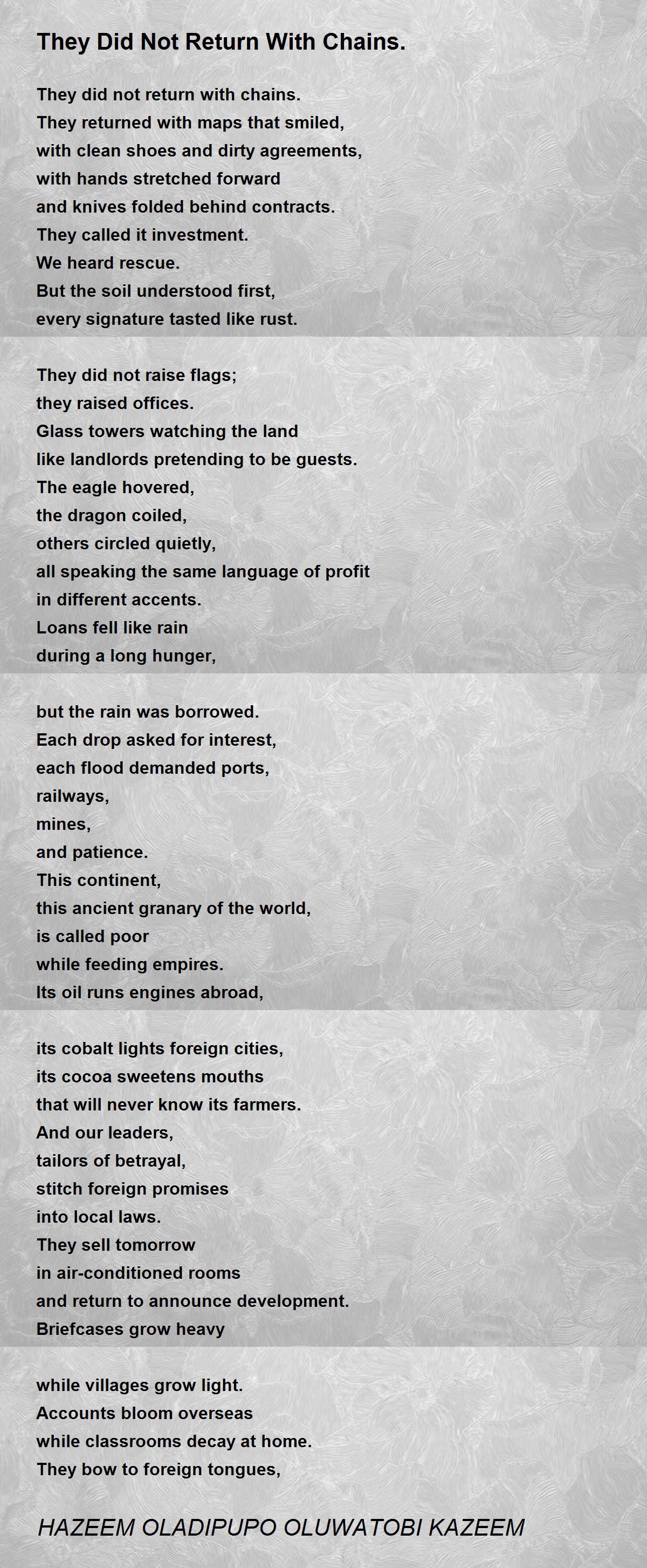 They Did Not Return With Chains. Poem by HAZEEM OLADIPUPO OLUWATOBI KAZEEM