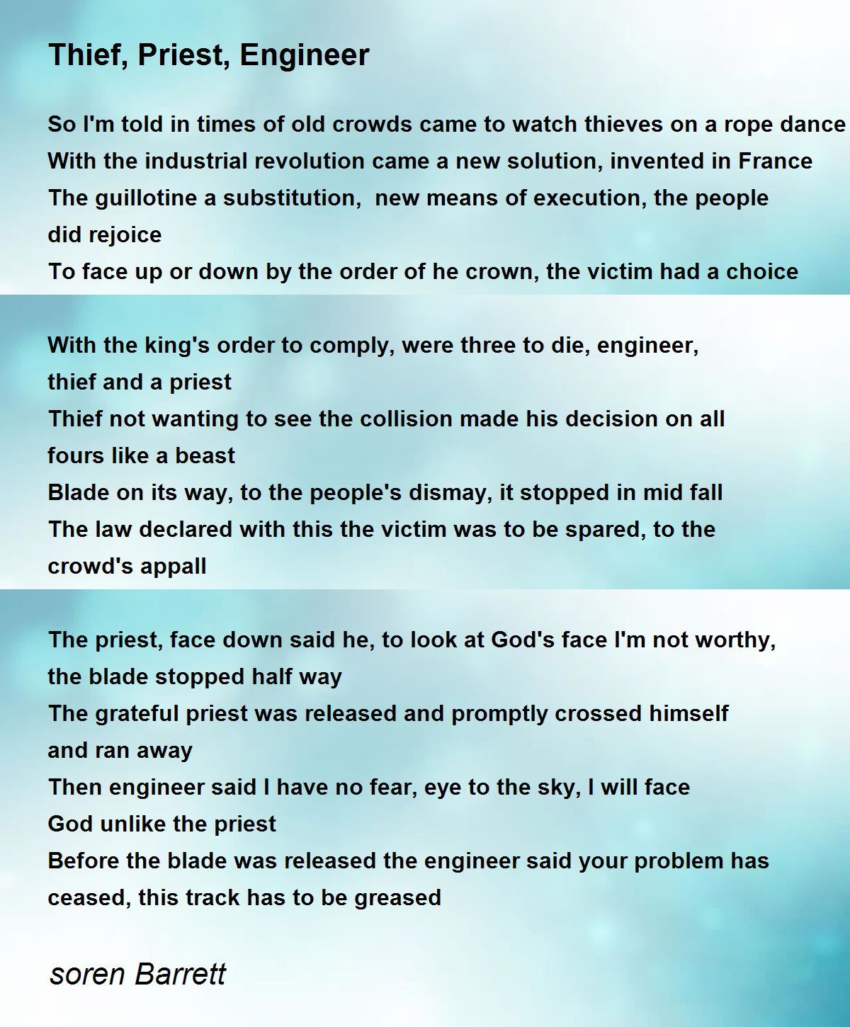 The priest, face down said he, to look at God's face I'm not worthy, the blade stopped half way