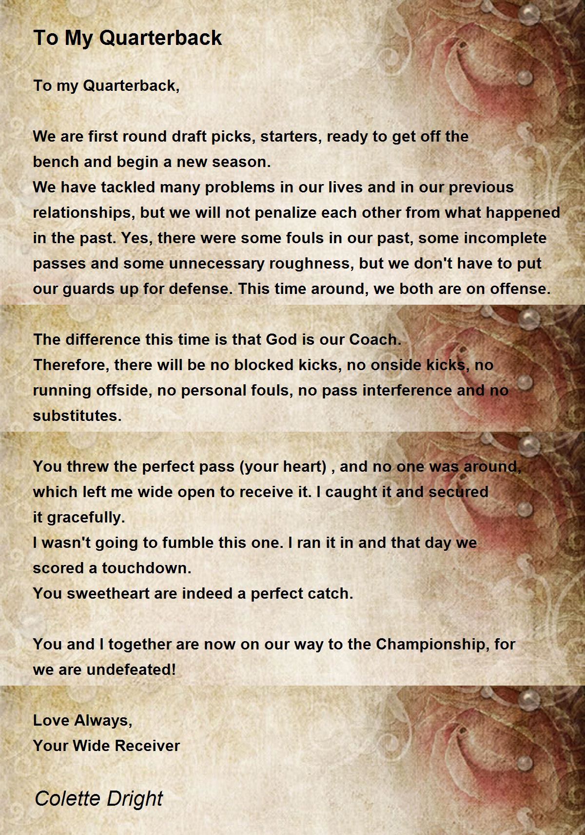 You threw the perfect pass (your heart) , and no one was around, which left me wide open to receive it. I caught it and secured it gracefully.