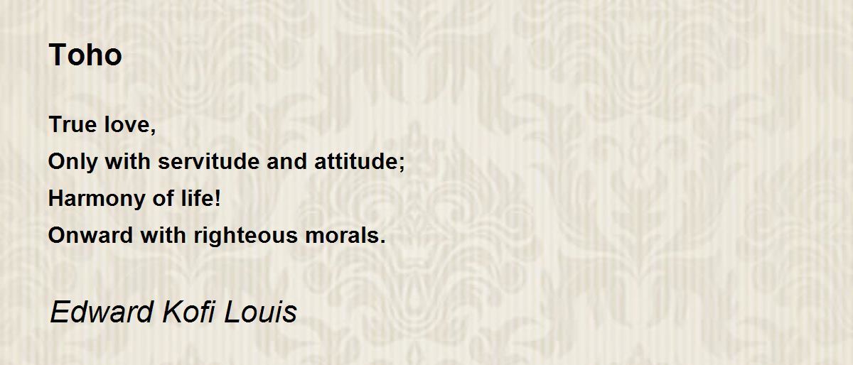 True love, Only with servitude and attitude; Harmony of life! Onward with righteous morals.