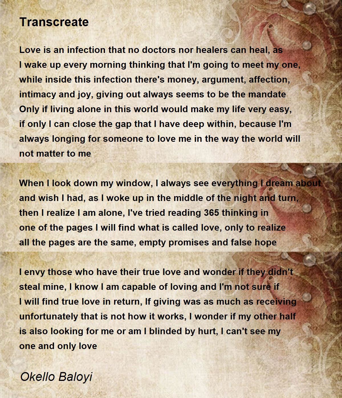 Love is an infection that no doctors nor healers can heal, as I wake up every morning thinking that I'm going to meet my one, while inside this infection there's money, argument, affection, intimacy and joy, giving out always seems to be the mandate